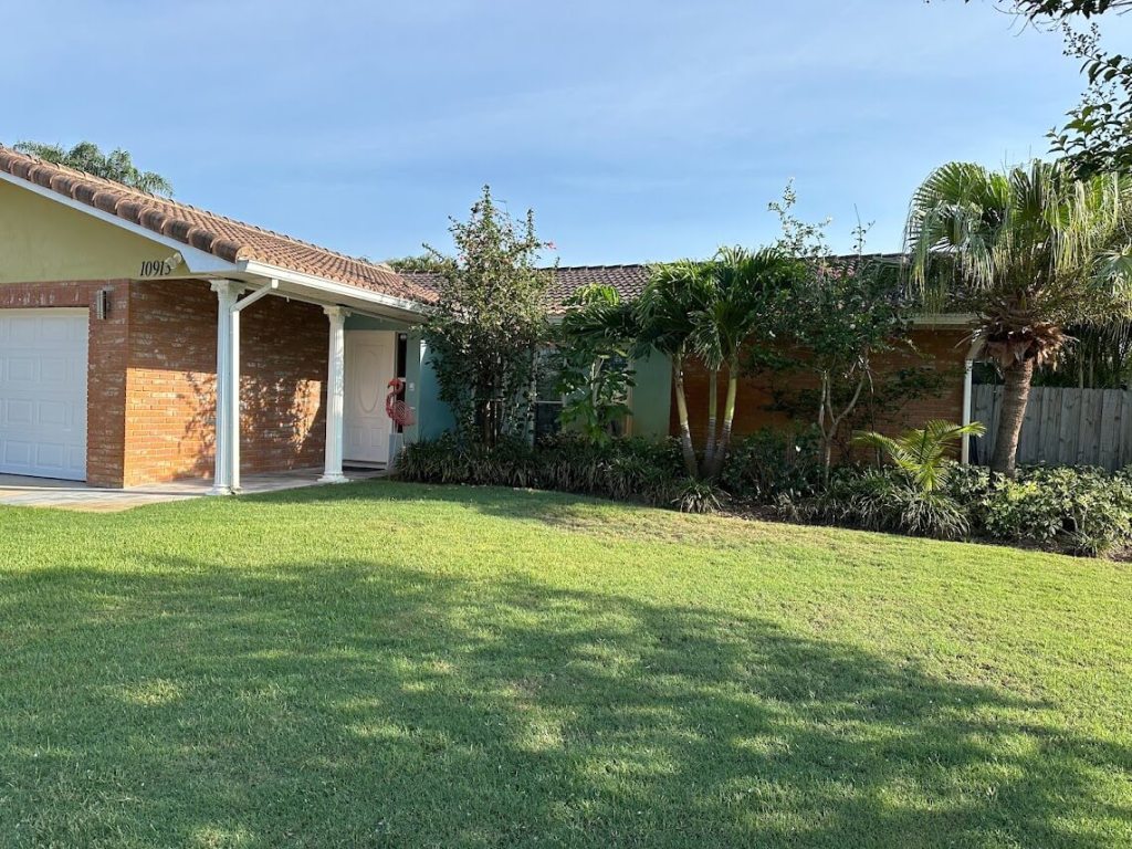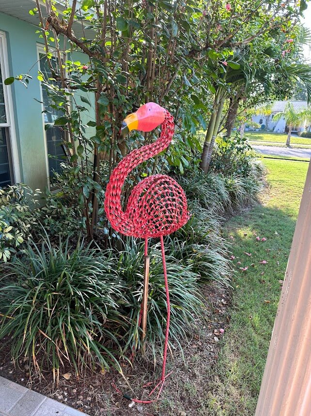 You’ll be greeted by a colorful home full of lush landscaping and the first flamingo you’ll encounter.