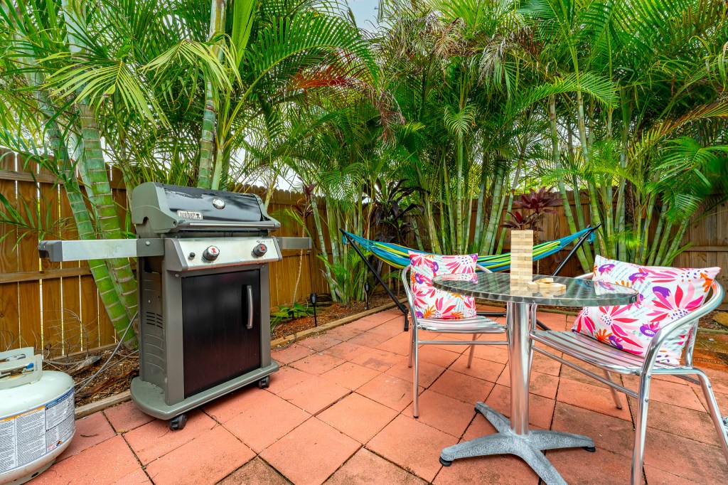 The palm surrounded grill area offers seating and a hammock to catch a quick nap.