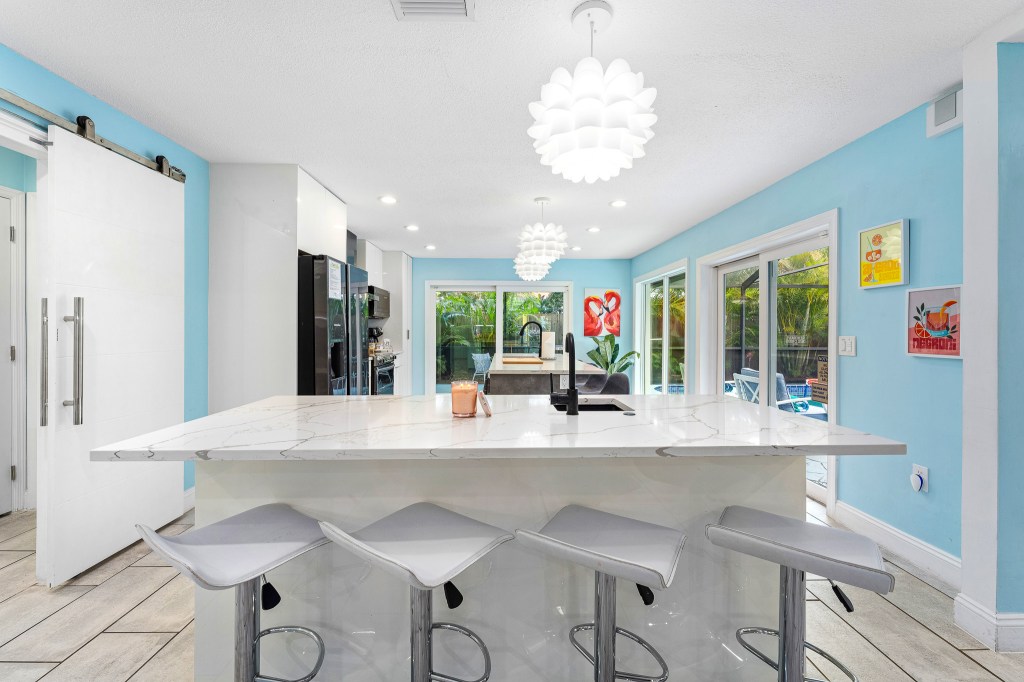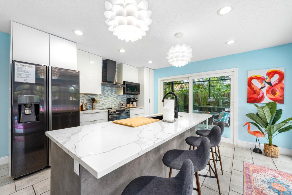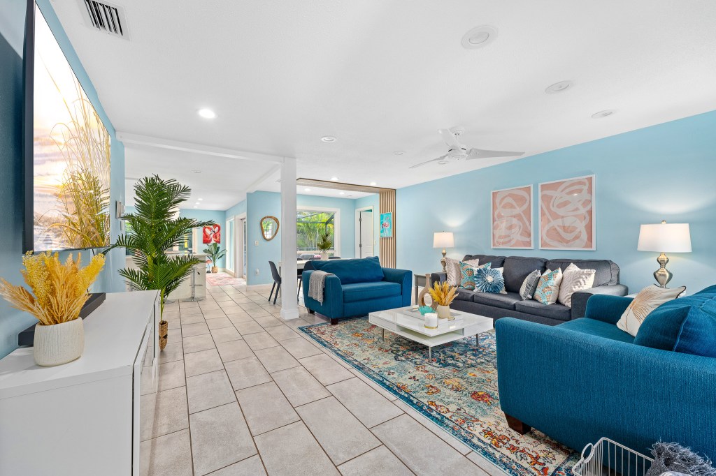 When you first step through the front door, you’ll be amazed by the open floor plan and fun Florida colors. From the modern kitchen with plenty of counter seating for all to the amazing floor to ceiling windows that bring the outside in. You will love the Flamingo House!